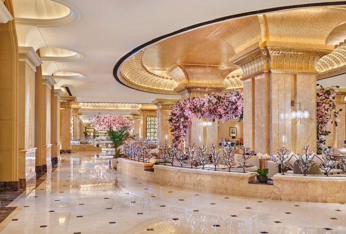 تتميز أجنحة الضيوف بسجاد فاخر يعكس فخامة المكان، حيث تتناغم الألوان الهادئة من الذهبي والبيج، ما يضفي طابعاً من الراحة والسكينة. يتسلل الضوء الطبيعي عبر النوافذ الواسعة والأسطح الزجاجية، ليخلق جواً هادئاً ودافئاً في المساحات التي تطل على الحدائق الخلابة. كما تضيف التفاصيل الخشبية المصقولة والأبواب المنحوتة لمسة فنية، مما يعزز الشعور بالدفء والراحة.