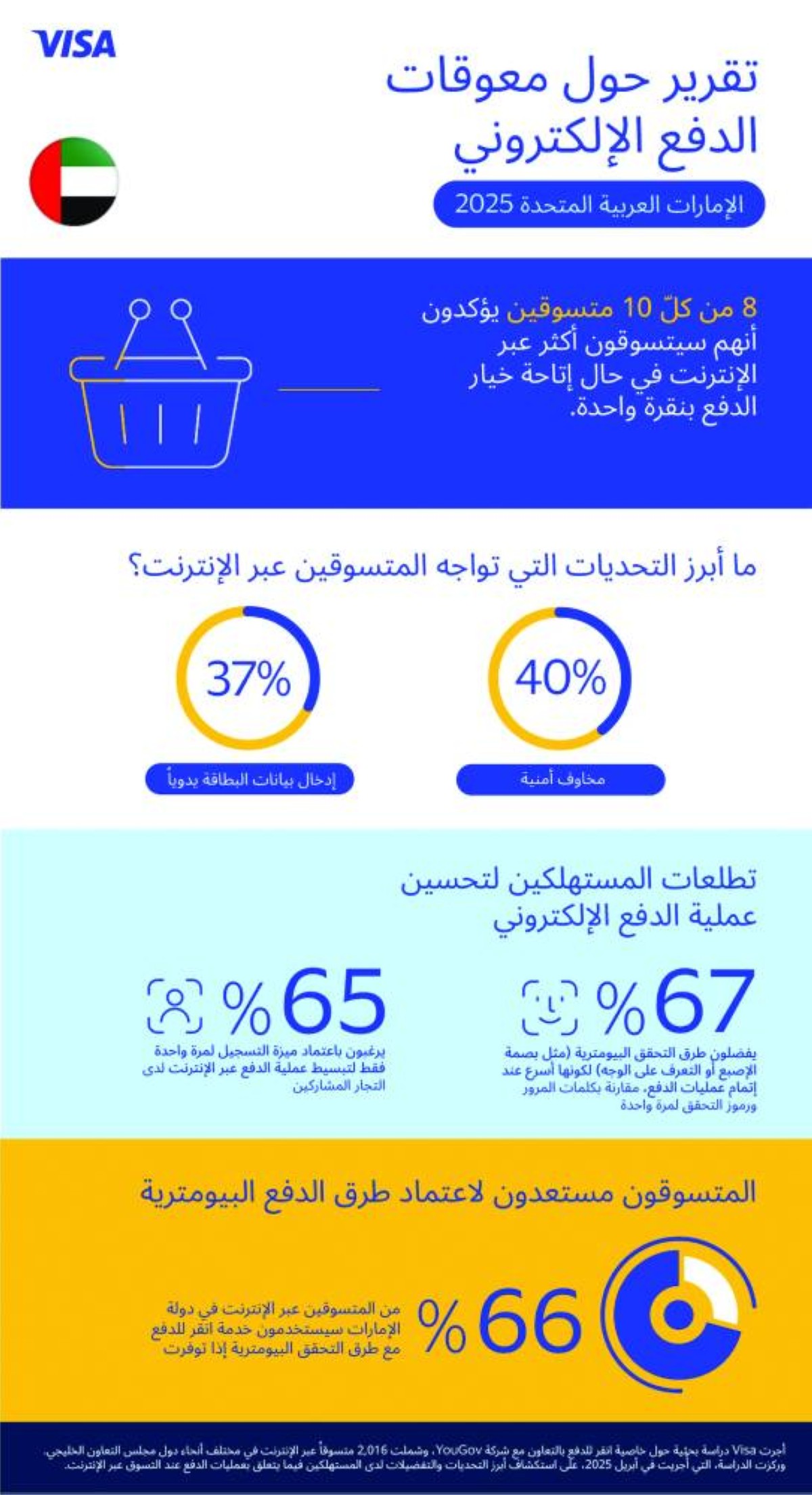 أعلنت شركة فيزا، نتائج «تقرير مشكلات عملية الدفع»، التي أظهرت الرغبة الكبيرة لدى المستهلكين في الإمارات في توفر تجربة تسوق إلكتروني أكثر أماناً وسلاسة. ورغم الانتشار الواسع للتسوق الإلكتروني والتقدم الملحوظ في نمو الاقتصاد الرقمي في دولة الإمارات، فإن الفرصة لا تزال متاحة أمام تجار التجزئة لتحسين تجربة الدفع وزيادة رضا العملاء. وتسلط الدراسة الضوء على الرغبة الكبيرة لدى المستهلكين في توفير تجربة تسوق إلكتروني أكثر أماناً وسلاسة.
