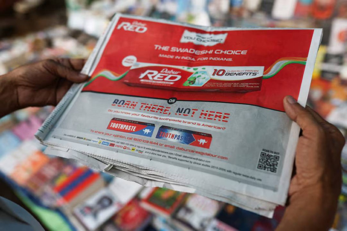 حولت الشركة الهندية دابر المنافسة لشركة كولجيت بالموليف الأمريكية معجون الأسنان الذي تنتجه إلى اختبار للوطنية، إذ تكثف الشركات الترويج للسلع المحلية وسط تدهور العلاقات التجارية مع الولايات المتحدة.