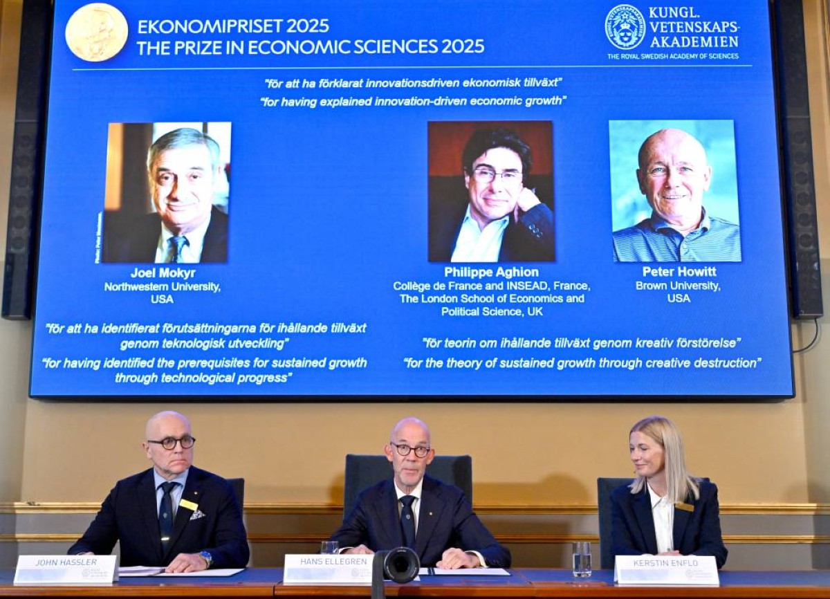 أعلنت الأكاديمية الملكية السويدية للعلوم، الاثنين، منح جويل موكر وفيليب أجيون وبيتر هاويت جائزة نوبل في الاقتصاد تقديراً «لتفسيرهم للنمو الاقتصادي المدفوع بالابتكار».