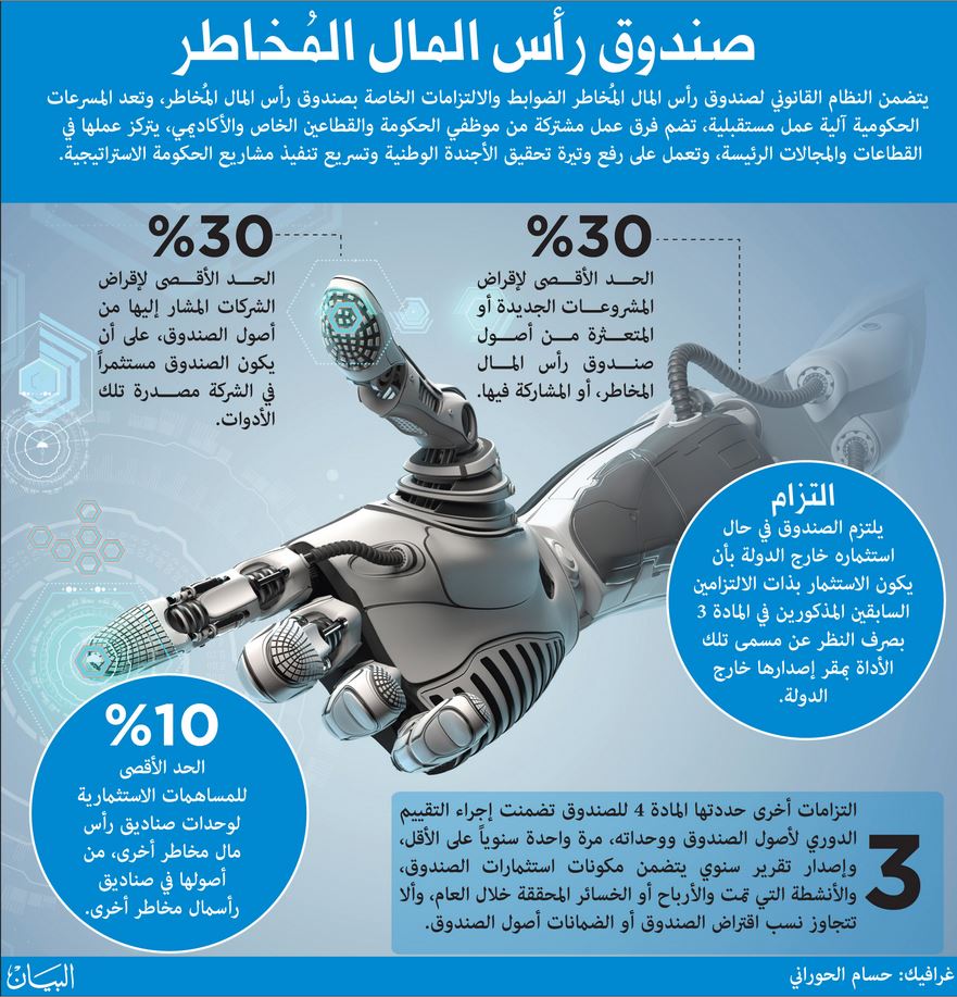 ويتضمن النظام القانوني لصندوق رأس المال المخاطر، الذي أنجزه فريق المسرعات الحكومية المشترك المكون من وزارة الاقتصاد وهيئة الأوراق المالية والسلع، الضوابط والالتزامات الخاصة بصندوق رأس المال المُخاطر.