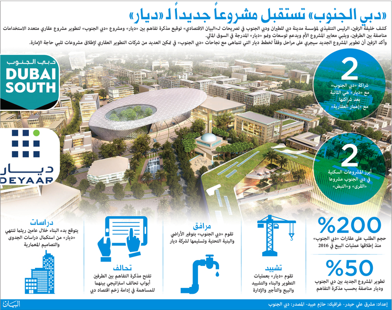 كشف خليفة الزفين، الرئيس التنفيذي لمؤسسة مدينة دبي للطيران ودبي الجنوب في تصريحات لـ«البيان الاقتصادي» توقيع مذكرة تفاهم بين «ديار» ومشروع «دبي الجنوب» لتطوير مشروع عقاري متعدد الاستخدامات مناصفة بين الطرفين، ويلبي معايير المشروع الأم ويدعم توسعات ونمو «ديار» المدرجة في السوق المالي.