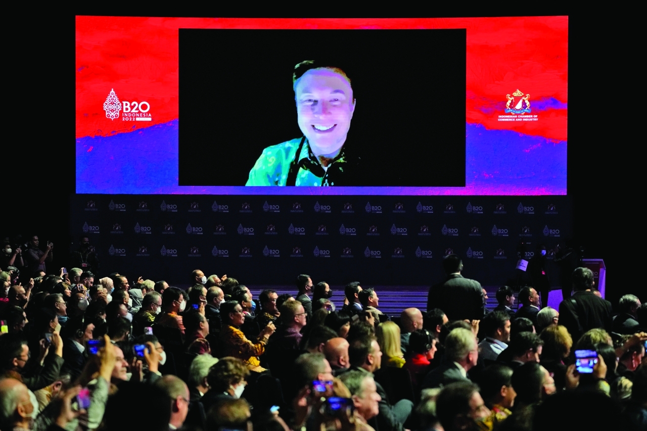 جالساً في الظلام ومرتدياً قميص باتيك الإندونيسي التقليدي ومحاطاً بالشموع، قدّم إيلون ماسك الاثنين رؤية للمستقبل، تشمل كائنات فضائية وأنفاقاً عميقة ورحلات سياحية... بالصواريخ. وظهر الملياردير والمالك الجديد لتويتر كأنه بلا جسد في رابط فيديو الاثنين ليخاطب رجال أعمال في بالي على هامش قمة مجموعة العشرين. لم يظهر منه إلا وجهه ويداه على خلفية سوداء.