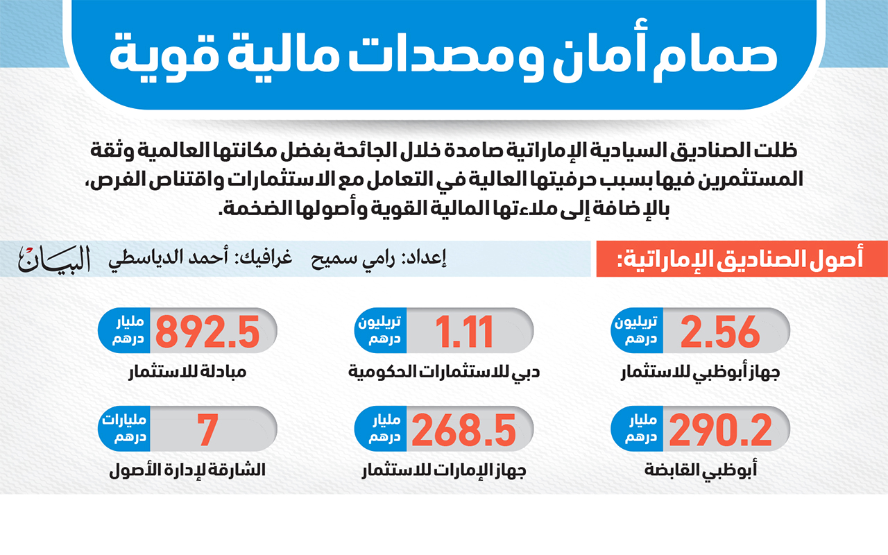 وتُمثّل الإمارات موطناً لصناديق سيادية رئيسة، بما في ذلك جهاز أبوظبي للاستثمار، ومؤسسة دبي للاستثمارات الحكومية، وشركة مبادلة للاستثمار، وأبوظبي القابضة، وجهاز الإمارات للاستثمار، والشارقة لإدارة الأصول، وذلك وسط الجهود التي تتخذها الدولة، لتعزيز استثماراتها ضمن تلك الصناديق، التي تعد إحدى أدوات استدامة الثروات محلياً، وظلت جميع هذه الصناديق الإماراتية، صامدة خلال الجائحة، بفضل مكانتها العالمية، وثقة المستثمرين فيها، بسبب حرفيتها العالية في التعامل مع الاستثمارات واقتناص الفرص، بالإضافة إلى ملاءتها المالية القوية، وأصولها الضخمة.