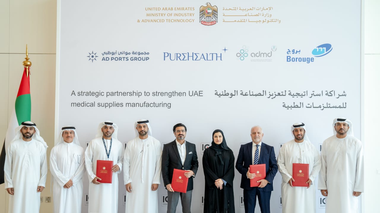 وبموجب الشراكة النوعية، سيبدأ العمل بين مجموعة "بيور هيلث" إحدى أكبر مزوّدي خدمات الرعاية الصحية في دولة الإمارات، والعضو في برنامج القيمة الوطنية المضافة التابع للوزارة، مع كلا من شركة أبوظبي للمستلزمات الطبية(ADMD) التابعة لمجموعة أبوظبي الوطنية للمشاريع الصناعية، ومجموعة موانئ أبوظبي، وشركة بروج للبتروكيماويات لتأسيس خط إنتاج للمعدات والمستلزمات الطبية الحاصلة على براءة اختراع في الإمارات بالعاصمة أبوظبي،بتكلفة 110 ملايين درهم، ومواد خام أولية من شركة بروج للبتروكيماويات، وتوفير أرض صناعية من خلال مجموعة موانئ أبوظبي في منطقة "أيكاد 1". وذلك لإنتاج الإبر الطبية ومحاقن الأنسولين، والقسطرات، ومنتجات التنفس الاصطناعي، ومعدات الوقاية الشخصية.