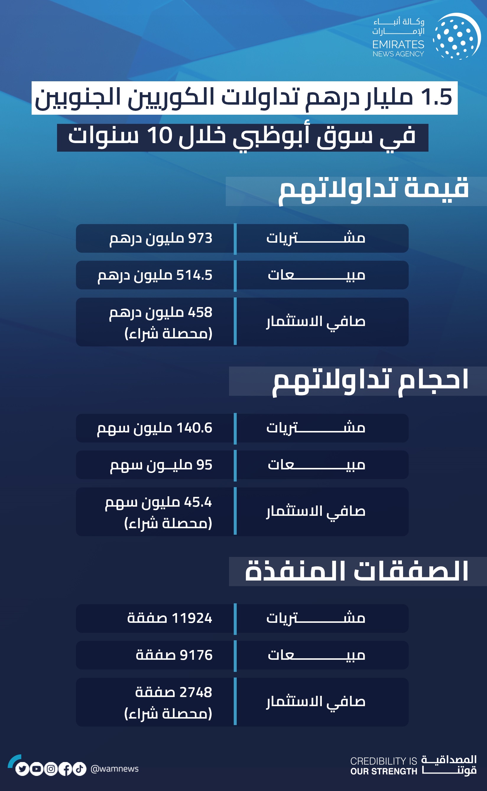 ناهزت تداولات المستثمرين من جمهورية كوريا في سوق أبوظبي للأوراق المالية 1.5 مليار درهم "بيعاً وشراءً" خلال الفترة من 2013 - 2022.