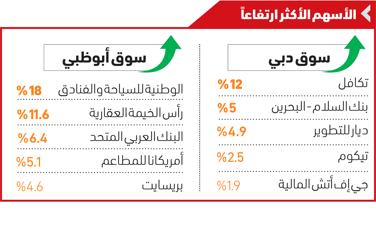 وفي سوق أبوظبي صعدت أسهم المؤسسة الوطنية للفنادق والسياحة 17.99%، ورأس الخيمة العقارية 11.6%، والبنك العربي المتحد 6.4%، وأمريكانا للمطاعم 5.12%، وبريسايت 4.61%، وغذاء القابضة 1.1%
