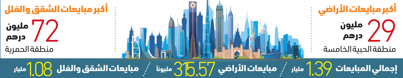 بلغت التصرفات العقارية في دائرة الأراضي والأملاك بدبي 2 مليار درهم، حيث شهدت الدائرة أمس تسجيل 512 مبايعة بـ 1.39 مليار درهم، منها 49 مبايعة للأراضي بـ 315.57 مليوناً، و463 مبايعة للشقق والفلل بـ 1.08 مليار درهم، وجاءت أهم مبايعات الأراضي بـ 29 مليون درهم في منطقة الحبية الخامسة، أما فيما يتعلق بأهم مبايعات الشقق والفلل، فقد جاءت مبايعة بقيمة 72 مليون درهم بمنطقة الحمرية كأهم المبايعات.