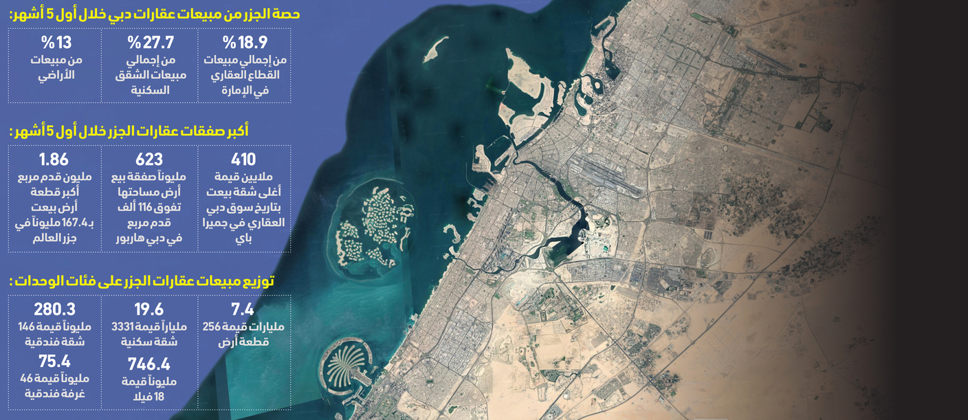 وسجلت الجزر التسعة في دبي خلال أول خمسة أشهر من العام الجاري 3802 صفقة بيع عقارية بقيمة إجمالية تجاوزت 28.2 مليار درهم، أي ما يشكل نحو 18.9 % من إجمالي المبيعات العقارية في دبي خلال هذه الفترة والتي بلغت 149 مليار درهم. وتضمنت مبيعات عقارات الجزر في دبي من يناير لغاية نهاية أبريل من العام الجاري 256 صفقة بيع للأراضي بقيمة 7.4 مليار درهم، أي 13 % من إجمالي قيمة مبيعات الأراضي خلال هذه الفترة. وتمثلت أغلى قطعة أرض تم بيعها في جزر دبي خلال أول 5 أشهر من العام الجاري في صفقة بيع لأرض مساحتها 116767 قدم مربع بقيمة 623 مليون درهم في دبي هاربور، أما أكبر قطعة أرض تم بيعها في الجزر فتقع في جزر العالم وتبلغ مساحتها 1860541 متر مربع وبلغت قيمتها 167.4 مليون درهم.