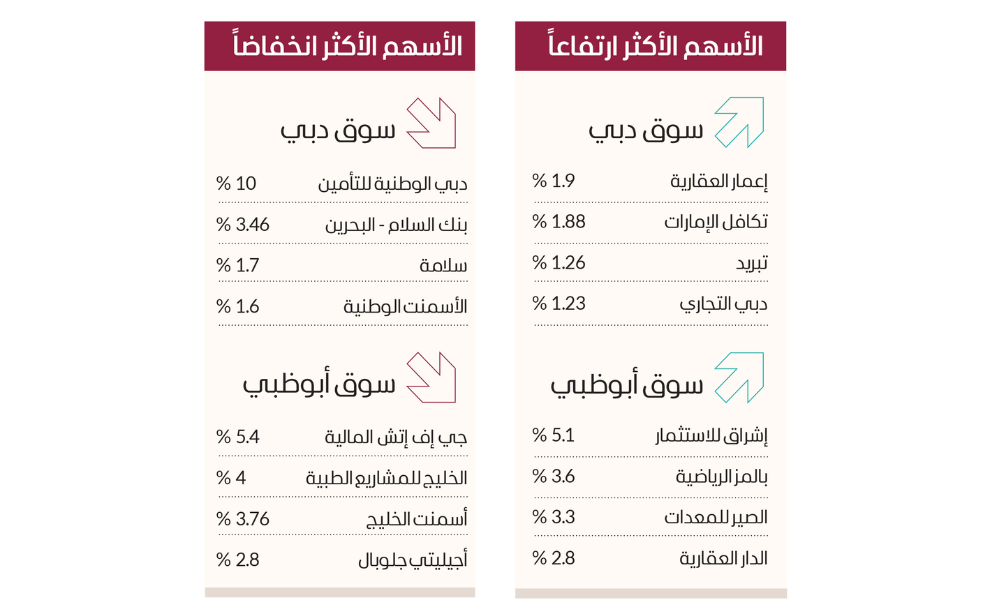 وكان ضمن الأسهم المرتفعة في سوق أبوظبي أسهم إشراق للاستثمار 5.1%، وبالمز الرياضية 3.6%، والصير للمعدات 3.3%، والدار العقارية 2.8%.