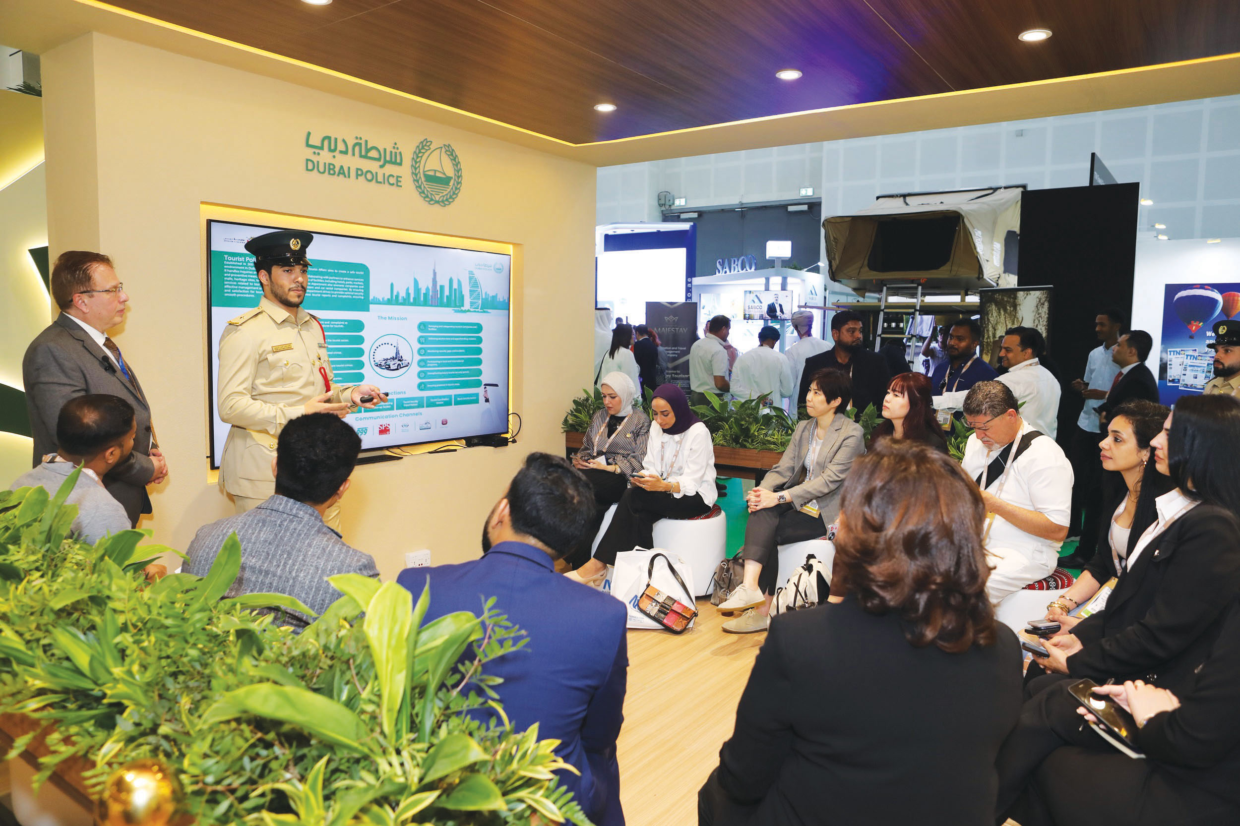 واطلعوا خلال زيارتهم على الخدمات المقدمة لزوار المعرض، ومنها خدمة الشرطة السياحية، والتي تقدمها شرطة دبي لإثراء تجربة المتعاملين في إمارة دبي ومنحهم رحلة سعيدة ومميزة لمختلف معالمها ومناطقها السياحية، بحيث تمكن السياح والزوار من التواصل معها عبر الخدمة المتوفرة على التطبيق الذكي لشرطة دبي والموقع الإلكتروني لشرطة دبي، والإجابة عن استفساراتهم واستقبال ملاحظاتهم ومقترحاتهم، وتقديم المساعدة في كل وقت، هذا إلى جانب إمكانية لجوء أفراد المجتمع إلى الشرطة السياحية لطلب المساعدة.