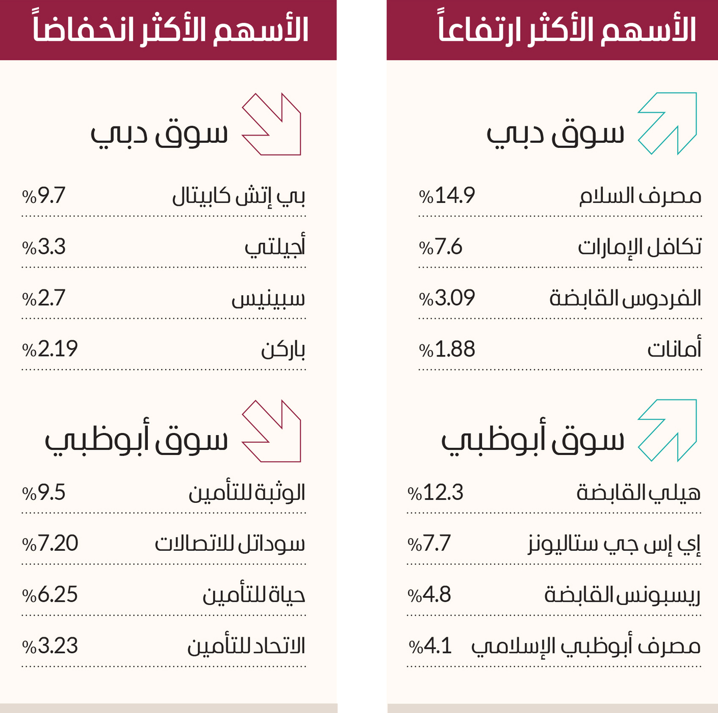 وتصدر الارتفاعات في سوق دبي سهم «مصرف السلام» بنسبة 14.9% ثم جاءت أسهم «تكافل الإمارات» بنسبة 7.6% و«الفردوس القابضة» 3.09% و«أمانات» مرتفعاً بنسبة 1.88%.