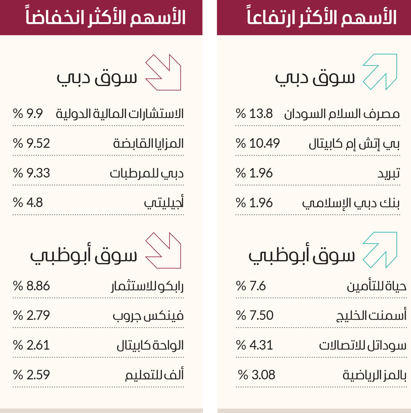 وتصدر مصرف السلام السودان أسهم الشركات المرتفعة بنسبة 13.8 %، ثم جاءت أسهم «بي إتش إم كابيتال» مرتفعة بنسبة 10.49%، و«تبريد» بنسبة 1.96%، وبنك دبي الإسلامي 1.96%، و«إعمار العقارية» مرتفعاً بنسبة 1.33%.