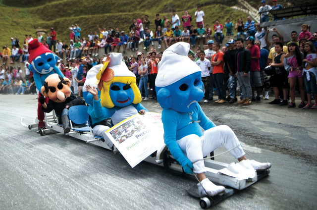 حشودٌ من محبّي السيارات وعشّاق كل ما له علاقة بأي شيءٍ تحتضنه العجلات التي تبهرجت أعلى إحدى التلال احتفالاً بانطلاق مهرجان السيارات بمدينة ميديلين في كولومبيا، أول من أمس، متأملين بأعينٍ مبتسمة فريقَ دمى مُشاركاً حان موعد انحداره من أعلى تل الاحتفال.
