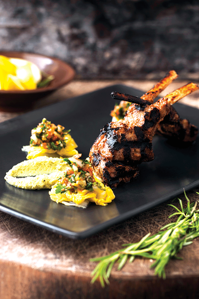 تُحضَّر التتبيلة عبر مزج كل المكونات، ومن ثم يُضاف لحم الضأن ويُنقع لساعتين على الأقل. يُنقع البرغل في الماء البارد ويُترك جانباً لمدة 20 دقيقة. في وعاء منفصل، يوضع الملفوف الصيني المُقطع مع ملعقتي طعام من الملح، ويُترك جانباً لمدة 30/40 دقيقة للتخلص من المرارة في الطعم. يُحضّر الإدامامي عبر غليه حتى يصبح طرياً لمدة 10 دقائق، ويوضع في الماء المثلج لبضع دقائق للحفاظ على لونه الأخضر الحيوي. ما إن يبرد تُصفى المياه، ويُمزج الإدامامي مع الطحينة، وعصير يوزو وزيت بذور العنب. تُضاف التوابل حسب الرغبة. تُحضر التبولة عبر تصفية البرغل المنقوع ووضعه في وعاء مزج، ثم يُغسل الملفوف وتُعصر الرطوبة الزائدة في قماش قطني رقيق. عندها تُضاف المكونات الباقية، وتُمزج جيداً ويُتبّل الخليط حسب الرغبة. يُبرَّد الخليط في الثلاجة حتى يصبح جاهزاً للتقديم. وحين يصبح جاهزاً للتقديم، تُشوى قطع لحم الضأن على الفحم أو في مقلاة على حرارة عالية لمدة 10 دقائق. وللحصول على علامات الشوي على الفحم، تُقلب قطع اللحم بعد انقضاء 4 دقائق. تُترك قطع اللحم لترتاح مدة 3 دقائق من أجل الحفاظ على عصارتها، يُقدَّم الطبق عبر وضع ملعقة من حمص إدامامي عليه، ومن ثم توضع قطع لحم الضأن المشوية مع حصة من التبولة على جانب الطبق.