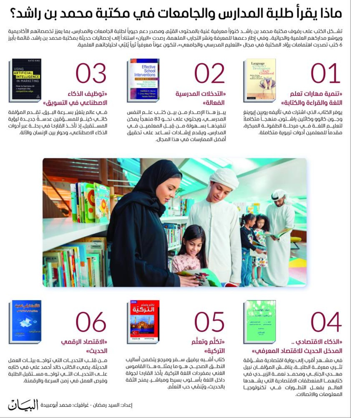 وفي إطار دعمها للمعرفة ونشر التجارب الملهمة، رصدت »البيان « استناداً إلى إحصائيات حديثة بمكتبة محمد بن راشد، قائمة بأبرز 6 كتب تصدرت اهتمامات روّاد المكتبة في مجال »التعليم المدرسي والجامعي «، لتكون عوناً معرفياً ثرياً يُلبّي احتياجاتهم العلمية.
