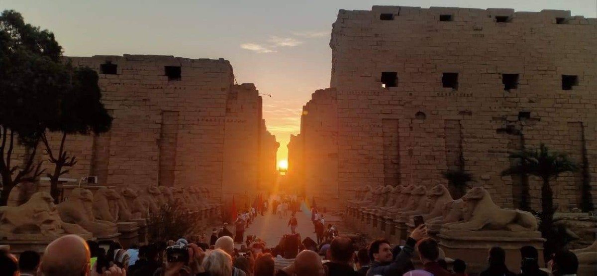 توافد آلاف الزائرين المصريين والسائحين إلى منطقة ميناء معابد الكرنك لمشاهدة ظاهرة تعامد الشمس على المحور الرئيسي للمعابد وسط أجواء احتفالية أقامتها سلطات محافظة الأقصر التاريخية بصعيد مصر.