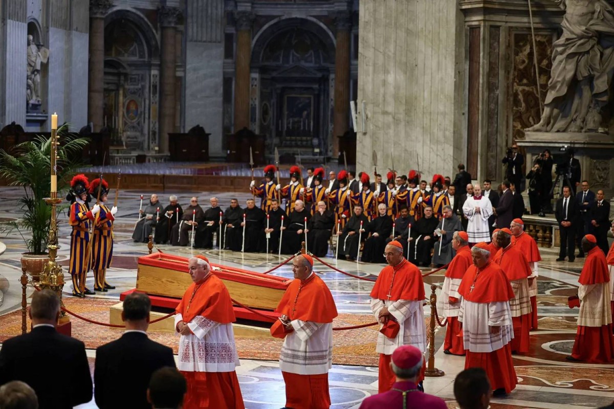 وصل جثمان البابا فرنسيس في نعش مكشوف، أمس، إلى كنيسة القديس بطرس بعد أن تم نقله من مقر إقامته داخل الفاتيكان أيضاً في موكب رسمي. وسار كرادلة وأساقفة يرتدون قبعات حمراء اللون ورهبان يحملون الشموع وأفراد الحرس السويسري ببطء في الساحة أمام كاتدرائية القديس بطرس.