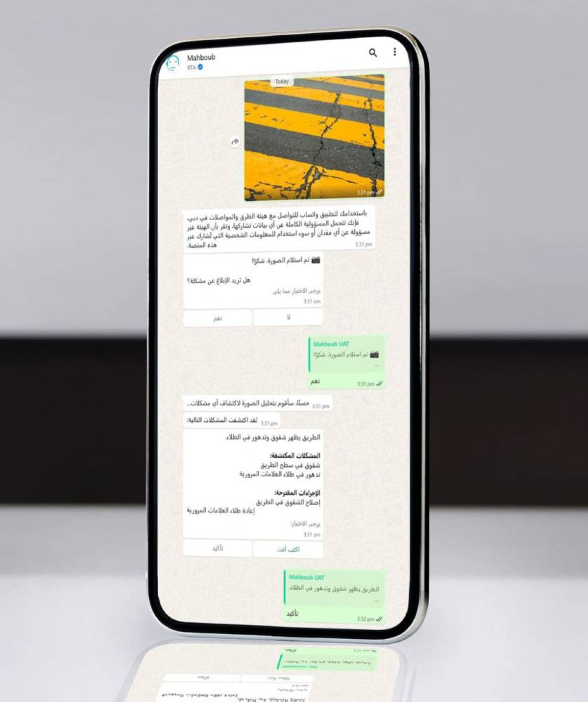أعلنت هيئة الطرق والمواصلات في دبي عن توفير خدمة الإبلاغ الذكي (مدينتي) من خلال المتحدث الآلي "محبوب" في تطبيق الواتساب، وذلك لتمكين سكان وزوار دبي من الإبلاغ بسهولة عن الأضرار المتعلقة بالبنية التحتية ومرافق النقل العام في الإمارة، ومنها الأضرار المتعلقة بحرم الطريق والأرصفة، ومظلات الحافلات، وإشارات المرور، واللوحات الإرشادية وغيرها من مرافق البنية التحتية.