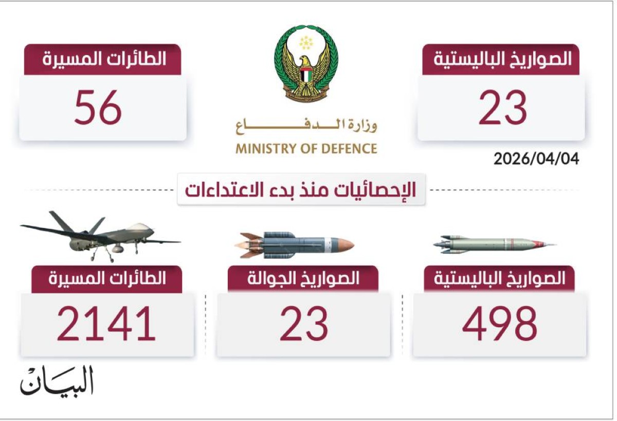 ومنذ بدء الاعتداءات الإيرانية السافرة، تعاملت الدفاعات الجوية الإماراتية مع 498 صاروخاً باليستياً، 23 صاروخاً جوالاً و2141 طائرة مسيّرة.