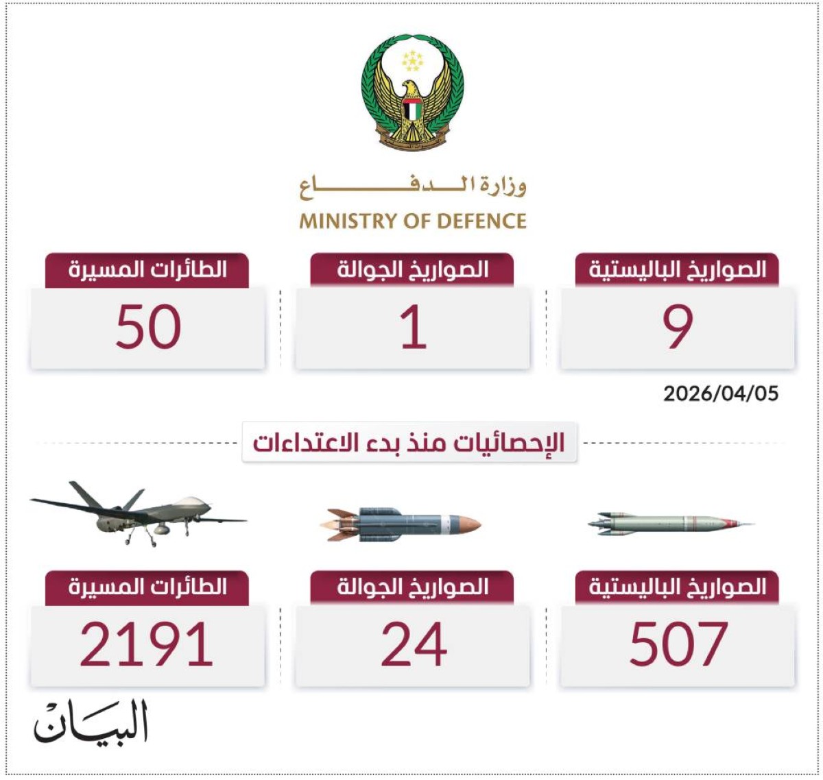 أعلنت وزارة الدفاع أن الدفاعات الجوية الإماراتية تعاملت، أمس، «5 أبريل 2026»، مع 9 صواريخ باليستية وصاروخ جوال و50 طائرةً مسيّرة قادمة من إيران. ولم تُسجَّل أي حالات استشهاد أو إصابات أو وفيات خلال الساعات الماضية.