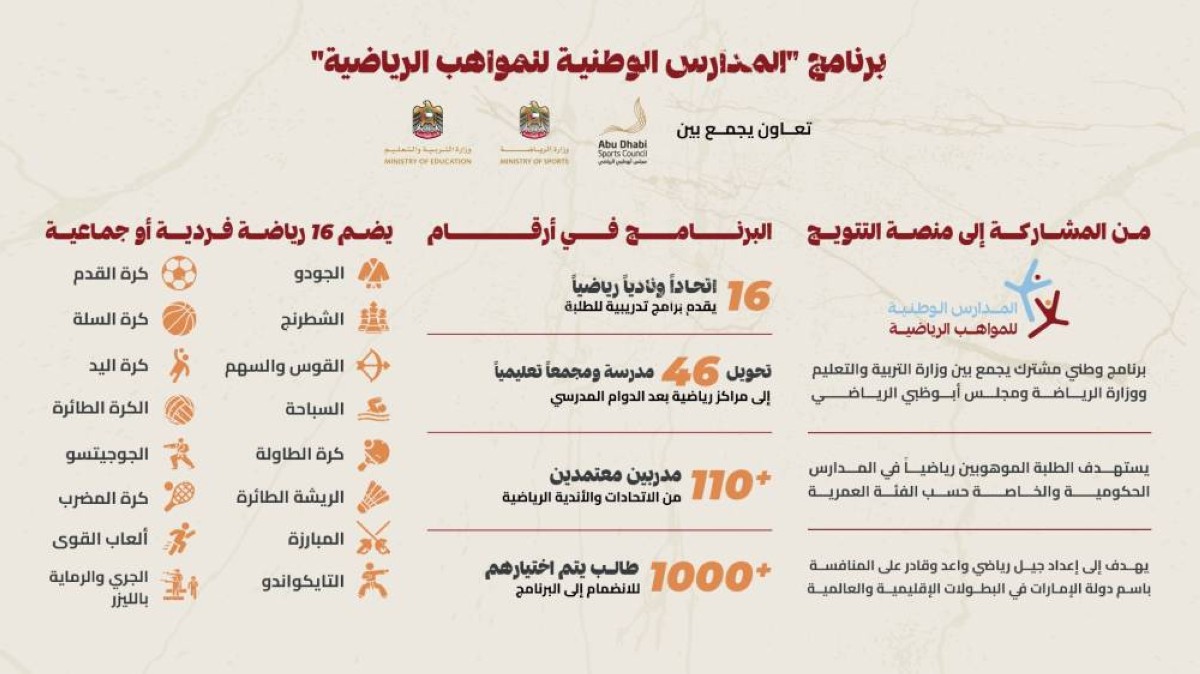 أعلنت وزارة التربية والتعليم بالتعاون مع وزارة الرياضة ومجلس أبوظبي الرياضي عن إطلاق برنامج «المدارس الوطنية للمواهب الرياضية» الذي يمثل أحد المشاريع الوطنية الاستراتيجية الرامية إلى تطوير الرياضة المدرسية وتحويلها إلى مسار مستدام لاكتشاف ورعاية المواهب الرياضية الناشئة في الدولة، ودعمها وتطويرها بما يحقق رؤية الدولة في هذا المجال.
