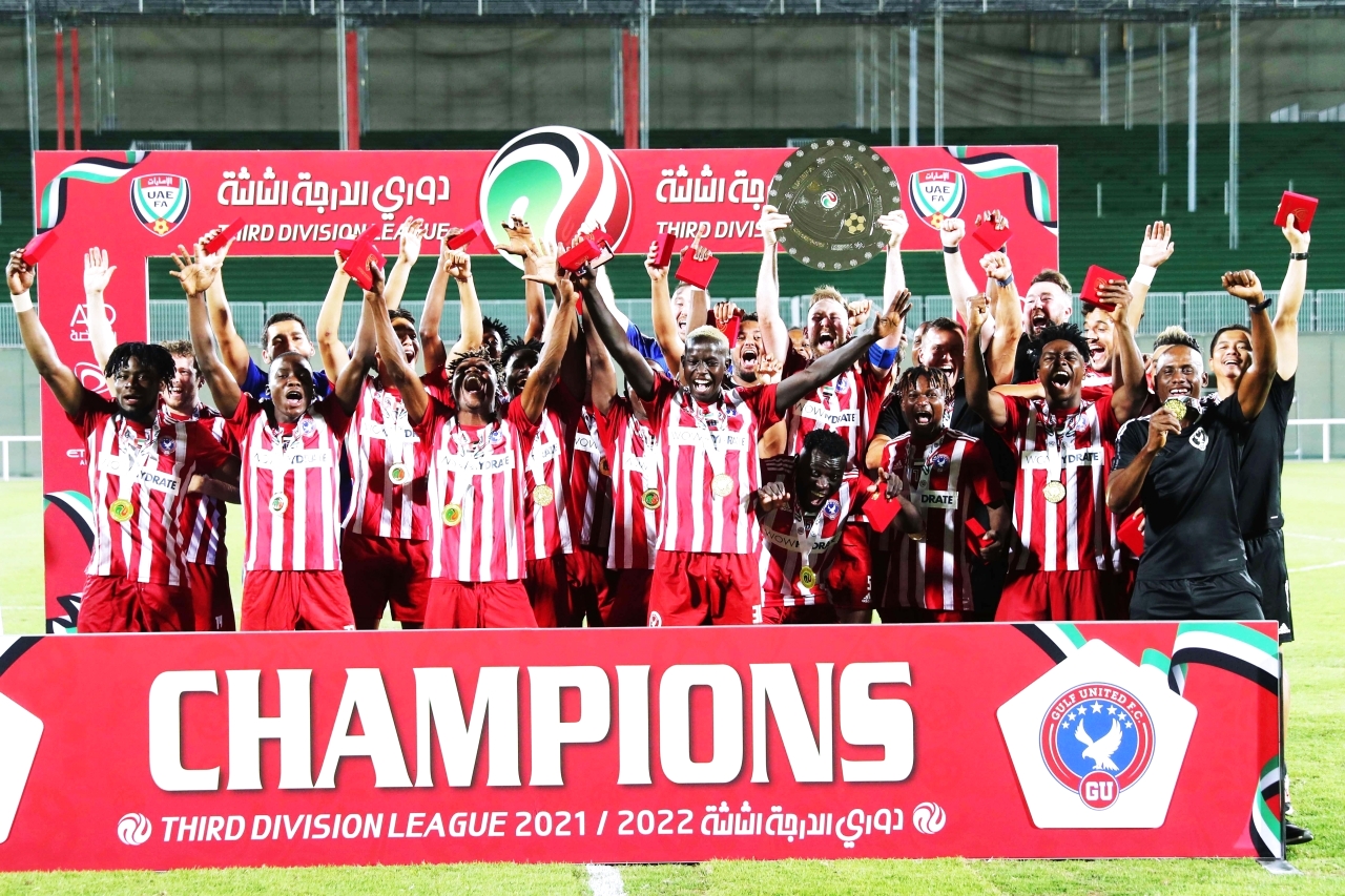 تُوج فريق غلف يونايتد بدرع بطولة النسخة الأولى لمسابقة دوري الدرجة الثالثة لكرة القدم بعد فوزه على فليتوود يونايتد 3 - 1 أ في المباراة النهائية بملعب «ذا سيفينز» في دبي.