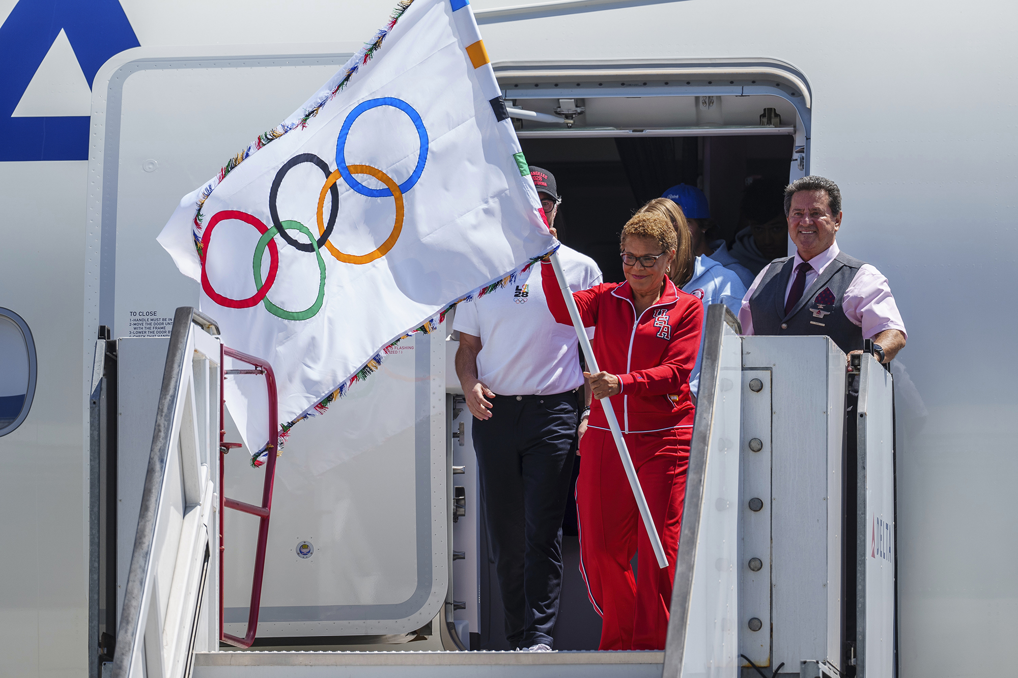 ونزلت رئيسة بلدية لوس أنجلوس كارين باس من الطائرة مرتدية زي رياضي أحمر للفريق الأمريكي وابتسمت بشدة وهي تلوح بالعلم الأولمبي قبل أن تنزل سلم الطائرة ليستقبلها حاكم ولاية كاليفورنيا جافين نيوسوم. ورافقت رئيسة بلدية لوس أنجلوس ديلاني شنيل متسابقة الغطس والمتزلج تيت كارو وآخرون.