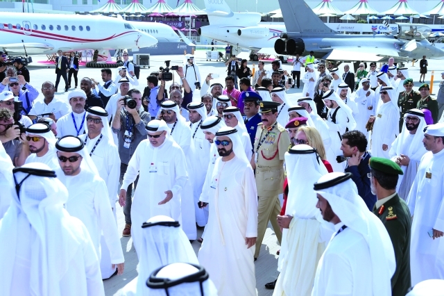 وتجول صاحب السمو الشيخ محمد بن راشد آل مكتوم في أرجاء المعرض وتفقد سموه عددا من الطائرات المدنية والعسكرية وبعض المعدات والتجهيزات الخاصة بهذه الطائرات وأنظمتها الإلكترونية مستهلا جولته بالسلام على فريق فرسان الإمارات للاستعراض الجوي وهنأهم على إبداعاتهم في الاستعراضات التي يؤدونها في معرض دبي الدولي للطيران كل عام وفي المعارض الإقليمية والدولية التي تشارك فيها دولة الإمارات، ثم صعد سموه ومرافقوه إلى طائرة الإيرباص ايه 350 المدنية التي تعرض لأول مرة في معرض دبي والتي لم يتم تصنيع سوى ست طائرات من هذا الجيل الجديد من الايرباص وتحمل على متنها 325 راكبا وهي مجهزة بأحدث التقنيات التي تضعها في مصاف الطائرات الفخمة والآمنة والمريحة. وقد استمع سموه من أفراد طاقم الطائرة التجريبية إلى تفاصيل مكوناتها التقنية والترفيهية وأهم المواصفات الحديثة لهذه الطائرة.