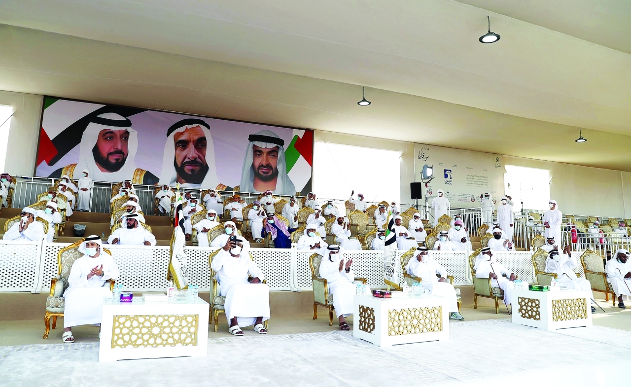 توج اللواء فارس خلف المزروعي، القائد العام لشرطة أبوظبي رئيس لجنة إدارة المهرجانات والبرامج الثقافية والتراثية، الفائزين بأشواط المفاريد المحليات والمهجنات الأصايل في مزاينة سويحان بمهرجان الظفرة بدورته الـ 15.