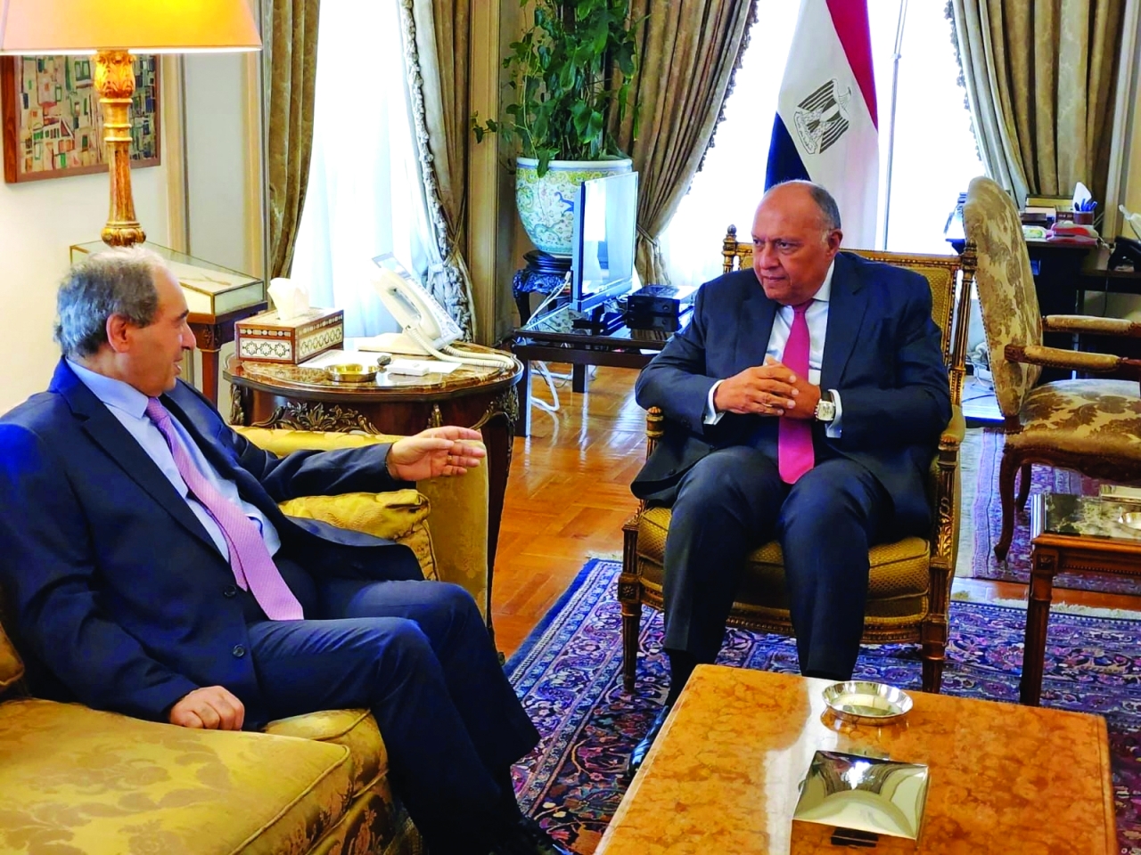 وصرح المتحدث، في بيان صحافي، إن الزيارة شهدت عقد لقاء ثنائي مغلق بين وزيري خارجية البلدين، أعقبه جلسة محادثات موسعة، شملت الوفدين المصري والسوري، تناولت مختلف جوانب العلاقات الثنائية، وسُبل دفعها وتعزيزها، بما يعود بالنفع والمصلحة على الشعبين الشقيقين، بالإضافة إلى عدد من الملفات الإقليمية والدولية ذات الاهتمام المشترك.