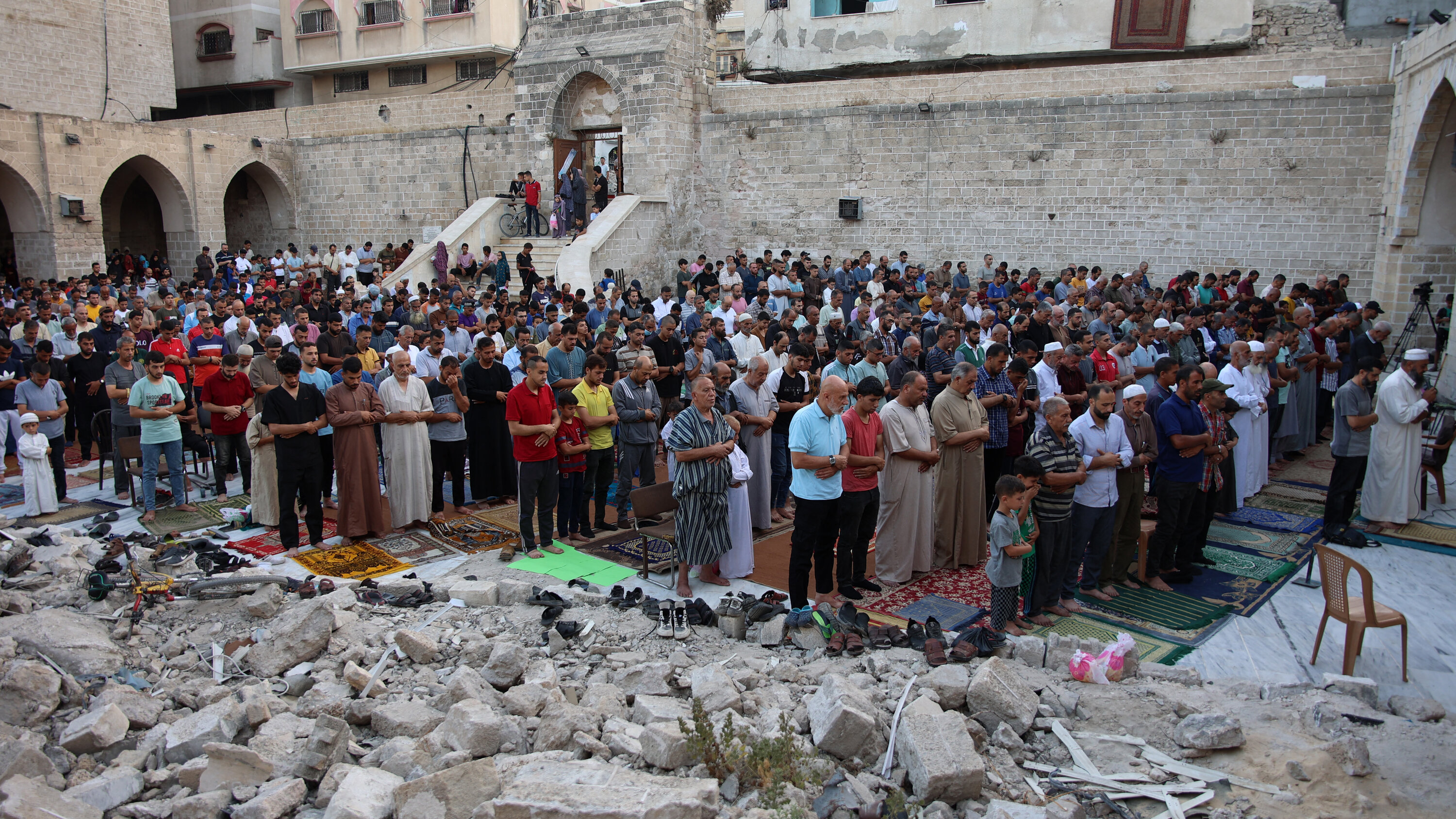 وتجمع عدد كبير من المصلين في باحة المسجد العمري في مدينة غزة، المتضرر بشدة من القصف الإسرائيلي.