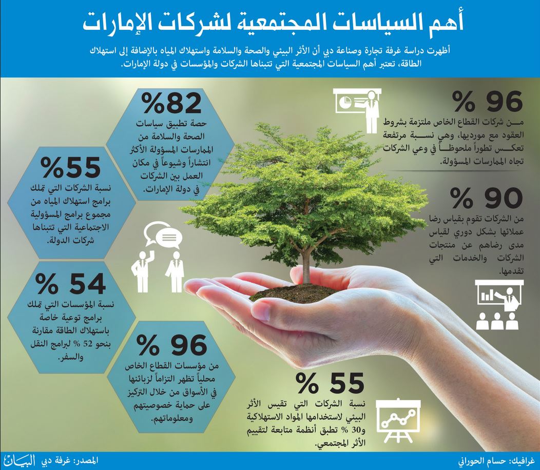 وأكد المهندس حمد بوعميم مدير عام غرفة تجارة وصناعة دبي أن 30% من الشركات والمؤسسات محلياً تمتلك ضمن خططها استراتيجية للمسؤولية الاجتماعية تقوم بتطبيقها، في حين أن 52% تدرك أهمية المسؤولية الاجتماعية في نشاطاتها وعملياتها وذلك بحسب تقارير مركز أخلاقيات الأعمال التابع للغرفة والتي أظهرت نمواً تدريجياً في وعي الشركات بالمسؤولية الاجتماعية.