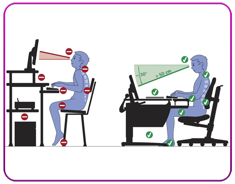 في المكتب أثناء العمل على جهاز الكمبيوتر، يجيب أن يكون وضع الجلوس مريحاً بحيث يكون العمود الفقري في وضع استقامة وأن يكون ظهر الكرسي مسانداً للفقرات القطنية أسفل الظهر ، و يجب أن يكون الكرسي قابلاً للتعديل في وضع الجلوس وأن تكون للكرسي قاعدة توفر أقصى درجات الثبات .