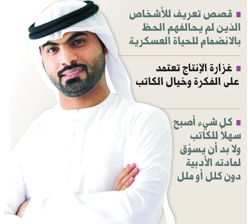 «البيان» التقت بالكاتب للحديث عن تجاربه الأدبية، وإصداره الأخير «حكايا الميدان»، والذي يتناول تجربته في الخدمة الوطنية عن دار «كتّاب» للنشر والتوزيع، ويقول: «كان الهدف من الكتاب، توثيق تجربتي الاستثنائية في الخدمة الوطنية، وتعريف المجتمع بأهميتها، وترسيخ المفاهيم والمصطلحات العسكرية، والأهم من كل ذلك، هذا الكتاب للأشخاص الذين لم يحالفهم الحظ، أو لا يستوفون شروط الانضمام، ليعرفوا عن الحياة العسكرية أكثر، وفي المقابل، رسالة مهمة جداً للعوائل، حتى يعرفوا ما الأشياء التي يتعلمها المجند في هذه التجربة العظيمة».