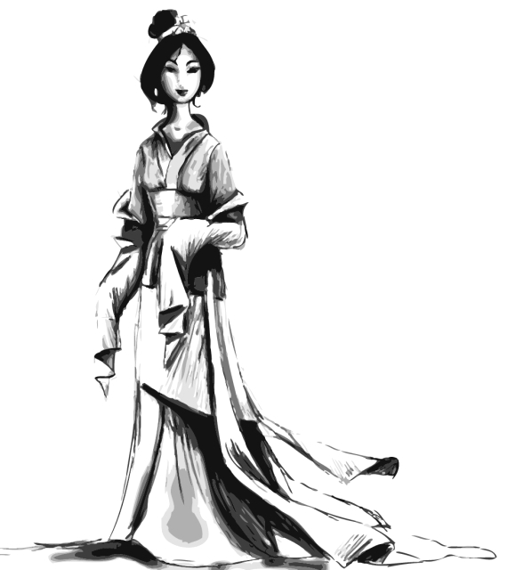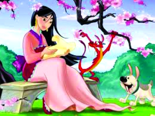 فتحت مولان باب الغرفة الشرقية، وجلست على الأريكة في الغرفة الغربية، ثم نزعت الدرع وارتدت ثوبها القديم. نظرت من النافذة وهي تسرّح السحاب في شعرها، وقفت أمام المرآة ووضعت البودرة الصفراء فوق وجنتيها ثم خرجت لتقابل رفاقها الذين انذهلوا ولم يصدقوا أن المقاتل الشجاع الذي حارب معهم هو امرأة.