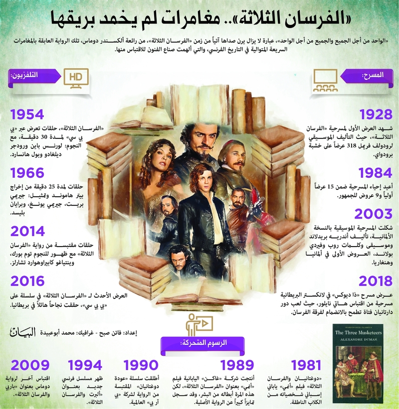 «الفرسان الثلاثة».. مغامرات لم يخمد بريقها «الواحد من أجل الجميع والجميع من أجل الواحد»، عبارة لا يزال يرن صداها آتياً من زمن «الفرسان الثلاثة»، من رائعة ألكسندر دوماس، تلك المغامرة العابقة بالمغامرات السريعة المتوالية في التاريخ الفرنسي، والتي ألهمت صناع الفنون للاقتباس منها.