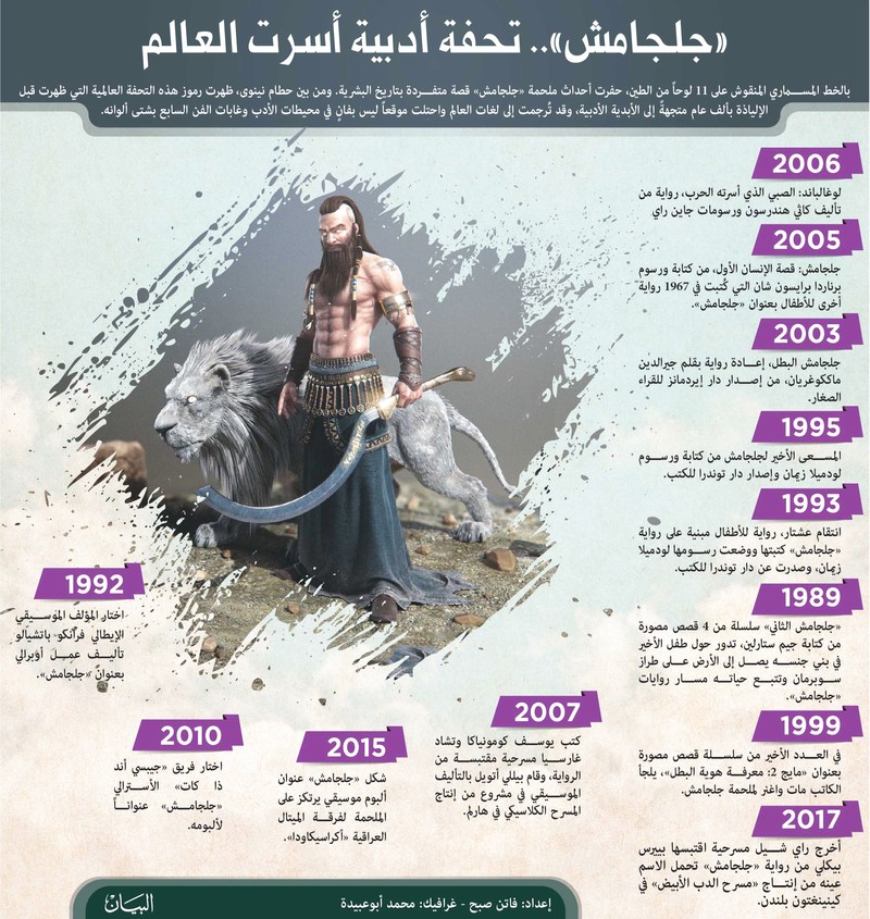 بالخط المسماري المنقوش على 11 لوحاً من الطين، حفرت أحداث «جلجامش» قصة بشرية بكاملها. ومن بين حطام نينوى، ظهرت رموز التحفة العالمية التي اكتُشفت قبل الإلياذة بألف عام متجهةً إلى الأبدية الأدبية، فتُرجمت إلى لغات العالم واحتلت موقعاً ليس بفانٍ في محيطات الأدب وغابات الفن السابع بشتى ألوانه.