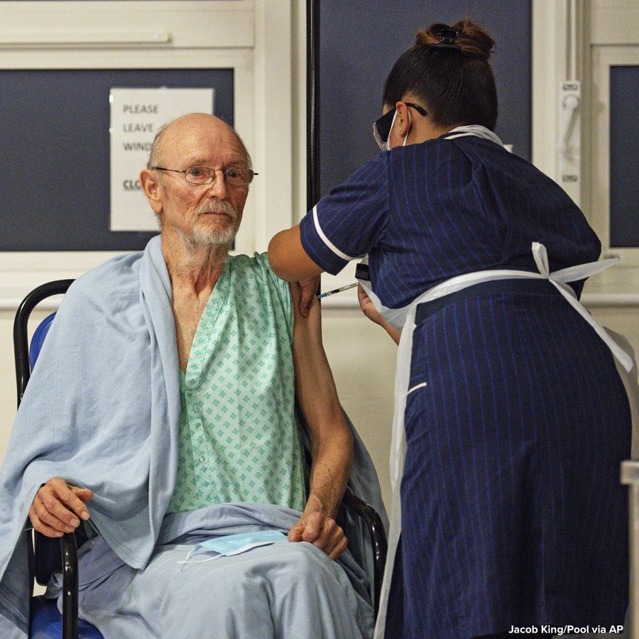 مع بدء التطعيمات في المملكة المتحدة اليوم، توافد عدد كبير من المسنين لأخذ الجرعات الأولى من اللقاح وكان أول شخص يتلقى اللقاح في بريطانيا هي الجدة مارجريت كينان أما الثاني فهو مسن يدعى ويليام شيكسبير يبلغ من العمر 81 عاماً.