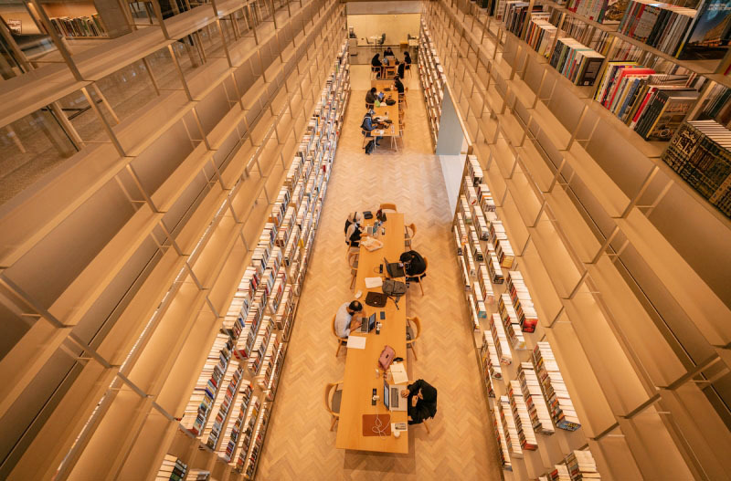 وعلى مساحة 12 ألف متر مربع يستقبل الزائر المكان بتصميمه الزجاجي وبسقفه المعدني البارز والشاهق وبحدائقه المحيطة التي تضم 331 شجرة ونوافير مائية، ليأخذك في جولة استثنائية بين رفوف تضم أكثر من 300 ألف عنوان في مختلف الحقول والتخصصات، منها 11 بلغات مختلفة و105 آلاف كتاب ورقي ونحو 250 ألف كتاب إلكتروني.