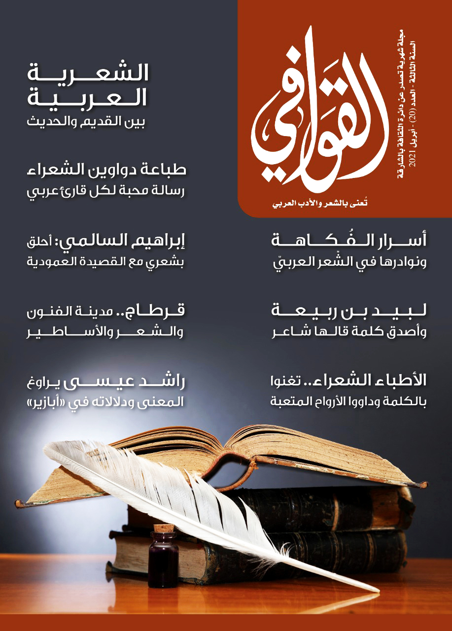 صدر عن بيت الشعر في دائرة الثقافة بالشارقة العدد 20 من مجلة «القوافي» الشهرية؛ وجاءت افتتاحية المجلة تحت عنوان «الشارقة تحتضن الشعراء على منابر الإبداع»، وفيها: الشعر هو حياة أخرى للأمم والشعوب، وقد أعطى صاحب السموّ الشيخ الدكتور سلطان بن محمد القاسمي عضو المجلس الأعلى حاكم الشارقة الكثير للثقافة العربية وللشعر العربي بكل أوجهه، من أجل أن يظـل الوهج العربي المتدفق بالجمال اللغوي ونضارته، هو معين الأدب الصافي الذي يمنح الحياة دفقة إنسانية متجددة في عصرنا الحاضر».