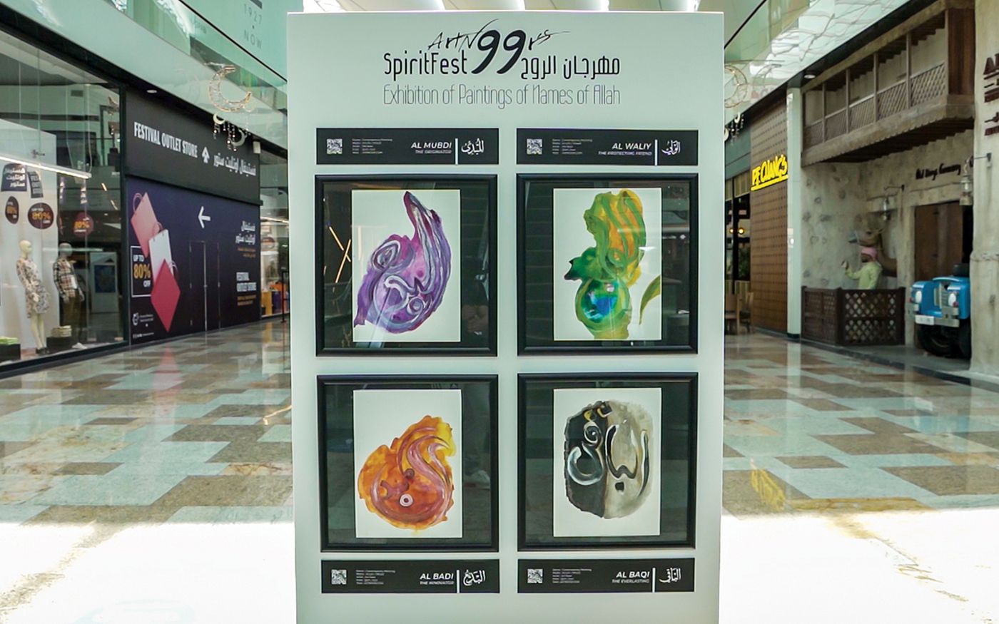 ويضم المعرض 15 لوحة فنية تمثّل أسماء الله الحسنى، وتتوزع في أرجاء المول، الذي يقدم هدية يومية لأول 100 زائر للمعرض؛ عبارة عن كتاب فني يحفظ أجواء هذه التجربة الفنية.