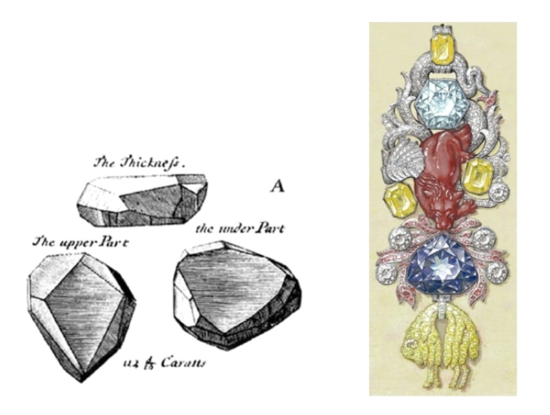 ويعتقد أن حجر الماسة جاء من منجم كولور في جولكوندا بالهند، وقد اشتراه في عام 1666 تاجر الأحجار الكريمة الفرنسي بابتيست تافيرنييه وعاد به إلى فرنسا وكان في وقتها بزنة 112 قيراطاً، وعرف باسم «تافيرنييه بلو»، وكان من الروعة بحيث إنه استحق ترصيعاً ملكياً، حيث اشتراه ملك فرنسا لويس الرابع عشر في عام 1668 وسرعان ما قطعه صائغ البلاط إلى حجر حوالي 67 قيراطاً.