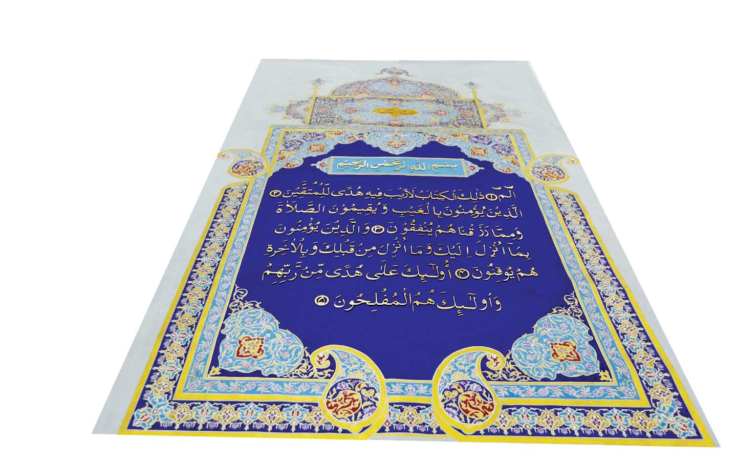 وقال رسام الذي سيحط رحاله في دبي 19 الجاري: «عملية نقش حروف القرآن الكريم تمت باستخدام مادة الألمنيوم المطلي بالذهب، ولأجلها قمت باختيار قماش عالي الجودة، ليكون عبارة عن الصفحات التي تحمل الآيات القرآنية». وأضاف: «عملية إنجاز هذه النسخة استغرقت مني 5 سنوات تامات».