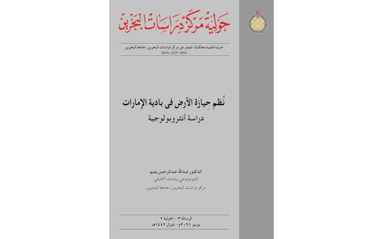 أصدر مركز دراسات البحرين في جامعة البحرين، مؤخراً، العدد الجديد من «حولية مركز دراسات البحرين»، تحت عنوان (نُظم حِيازَة الأرض في بادية الإمارات... دراسة أنثروبولوجية)، وأوضح رئيس المركز ورئيس تحرير الحولية، الدكتور محمد أحمد عبدالله، أن الإصدار الجديد هو بمثابة الرسالة الثالثة من الحولية، وهو من تأليف الدكتور عبدالله عبدالرحمن يتيم، الأنثروبولوجي والباحث الأكاديمي في المركز.