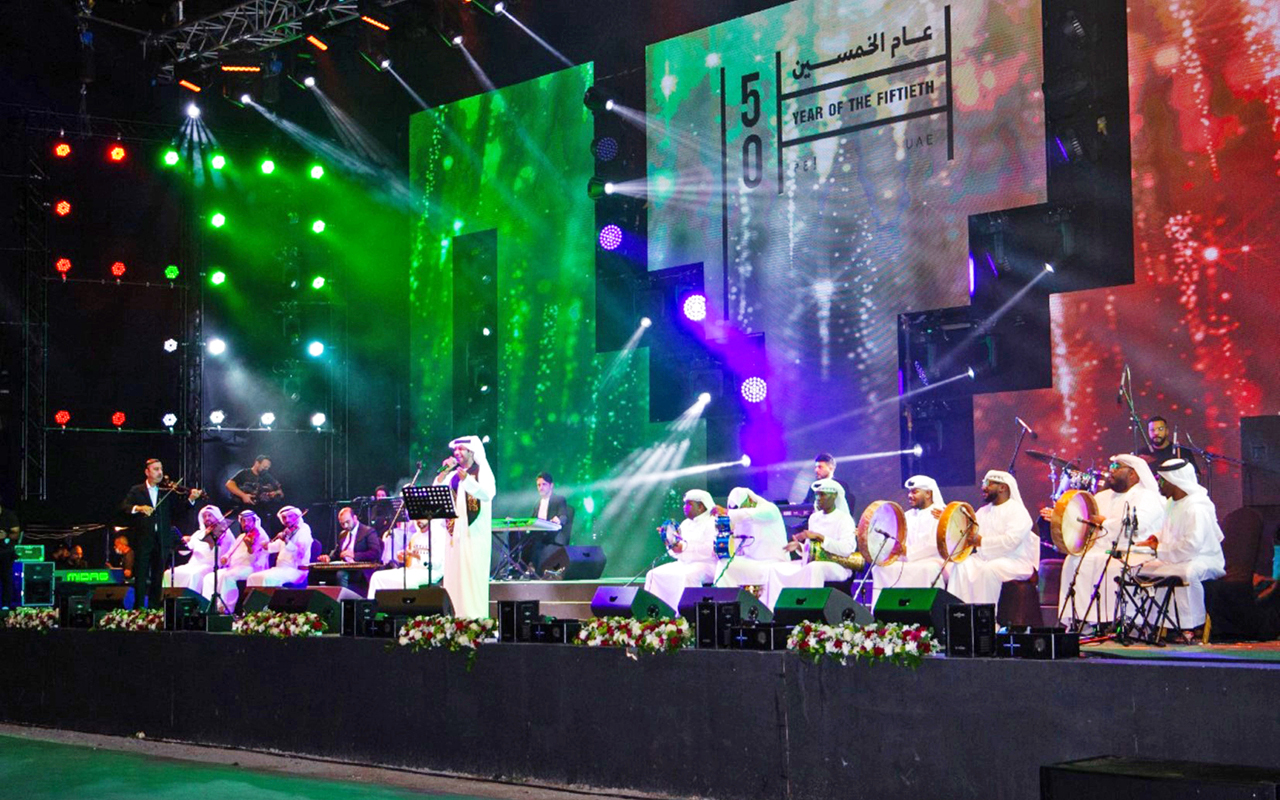 وشارك في الحفل الذي حظي بحضور جماهيري غفير، خمسة من نجوم الغناء الإماراتي والعربي الذين قدّموا أداءً متميّزاً لباقات متنوعة من الأغاني الوطنية والوجدانية التي تفاعل معها الحضور، تزامناً مع احتفالات الدولة باليوبيل الذهبي وعيد الاتحاد الخمسين.