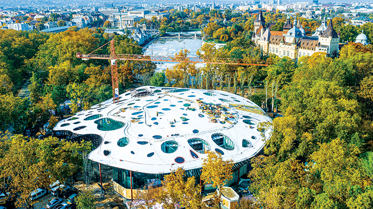 يرتفع متحف الموسيقى الهنغارية من قلب حديقة بودابست، مغوياً رقيقاً مرصعاً بالأشجار. ويبدو المتحف مثل فطيرة صغيرة تعلقت على أكمة من الأغصان تظهره في هيئة أسطوانة منقوشة بالحفر، التي هي كوات تستقبل الضوء.