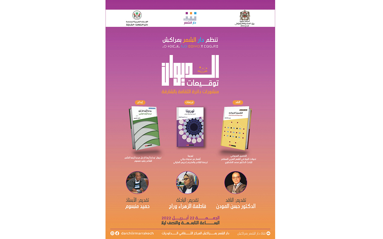 تنظم دار الشعر بمراكش، ضمن التعاون الثقافي المشترك بين وزارة الشباب والثقافة والتواصل بالمملكة المغربية ودائرة الثقافة في الشارقة، واحتفاءً باليوم العالمي للكتاب وحقوق المؤلف، فقرة «الديوان» ضمن برنامج «توقيعات» وذلك غداً الجمعة، الساعة التاسعة والنصف ليلاً بمقر الدار الكائن بالمركز الثقافي الداوديات، احتفاءً بإصدارات جديدة لشعراء ونقاد ومترجمين مغاربة. وتنتظم هذه الفقرة الجديدة في دورة أولى، على أن تتواصل شهر يونيو القادم احتفاءً بعناوين صدرت ضمن منشورات دائرة الثقافة بالشارقة.