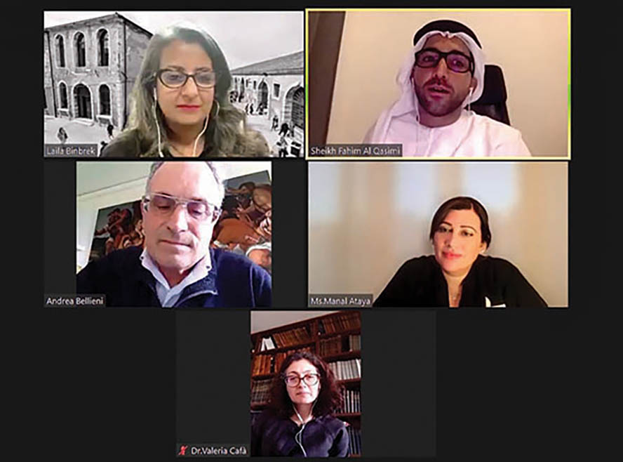 واستضافت الجلسة التي أدارتها منال عطايا مدير عام هيئة الشارقة للمتاحف، كلاً من الشيخ فاهم بن سلطان بن خالد القاسمي، الرئيس التنفيذي لدائرة العلاقات الحكومية في الشارقة، والدكتور آندريا بيليني، رئيس وأمين متحف كورير، مؤسسة البندقية للمتاحف المدنية وليلى بن بريك، المديرة المنسقة للجناح الوطني لدولة الإمارات العربية المتحدة في بينالي البندقية، والدكتورة فاليريا كافيه أمين متحف كورير، مؤسسة البندقية للمتاحف المدنية.