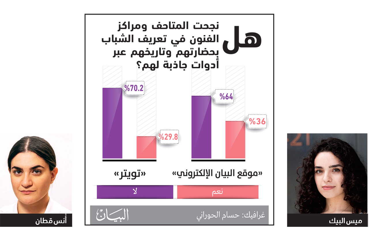 «البيان» حاولت من خلال الاستطلاع الأسبوعي، أن تضيء على أهمية المتاحف ومراكز الفنون كمدارس ثرية، ومنصات نوعية في مد الأجيال بمعلومات وافية عن تراثهم وتاريخهم مضيئة في الصدد مدى نجاحها في توثيق الفنون والتاريخ وتعريف الشباب بحضاراتهم، حيث طرحت سؤالاً على متابعيها، عبر منصاتها في فضاءات مواقع التواصل، مفاده: هل نجحت المتاحف ومراكز الفنون في تعريف الشباب بحضارتهم وتاريخهم عبر أدوات جاذبة لهم؟
